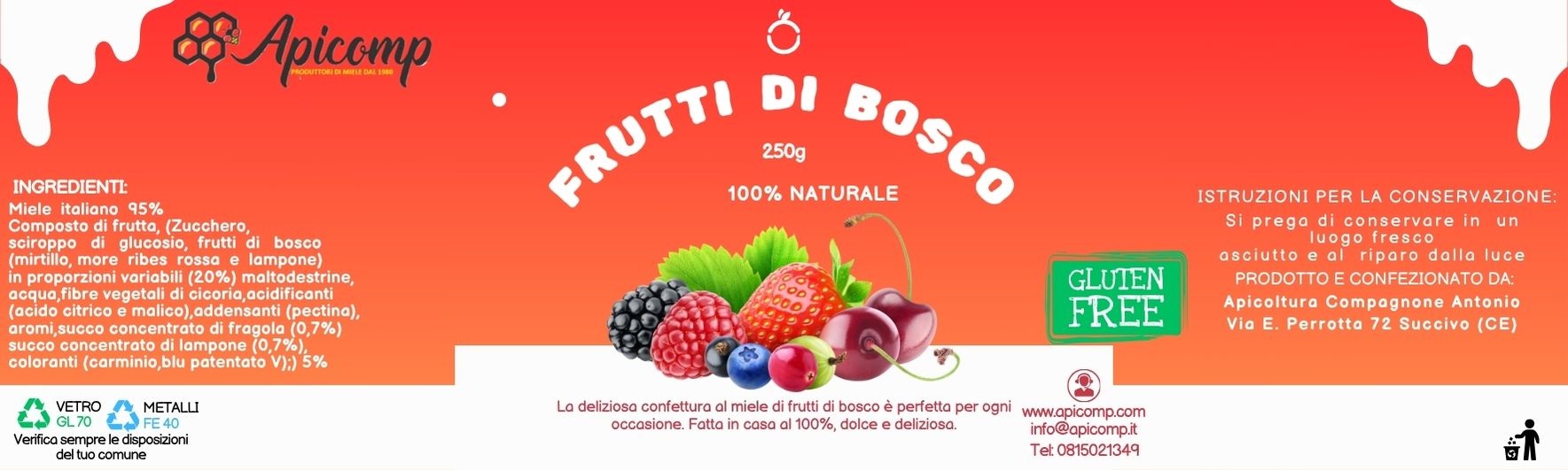 Preparato alimentare a base di (miele, Zucchero,sciroppo di glucosio, frutti di bosco (mirtillo, more ribes rossa e lampone) in proporzioni variabili (20%) maltodestrine, acqua,fibre vegetali di cicoria,acidificanti (acido citrico e malico),addensanti (pectina),aromi,