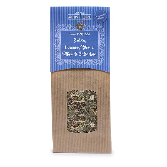 Melissa foglie, verbena foglie, salvia foglie, lemon grass, limone scorza, ribes rosso, calendula petali, aroma naturale.