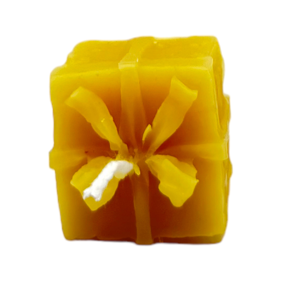 Candela profumata al miele a forma di pacco regalo piccolo.